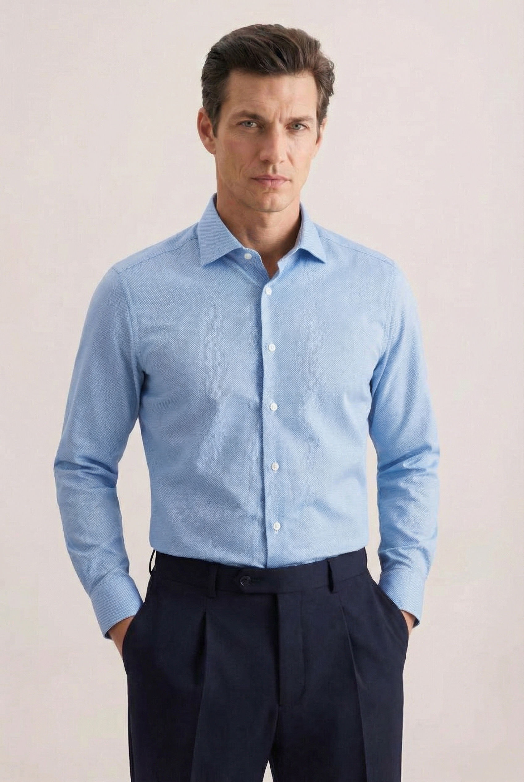 • Tailored fit, Классический воротник, Классический (на пуговице), Однотонный, Голубой