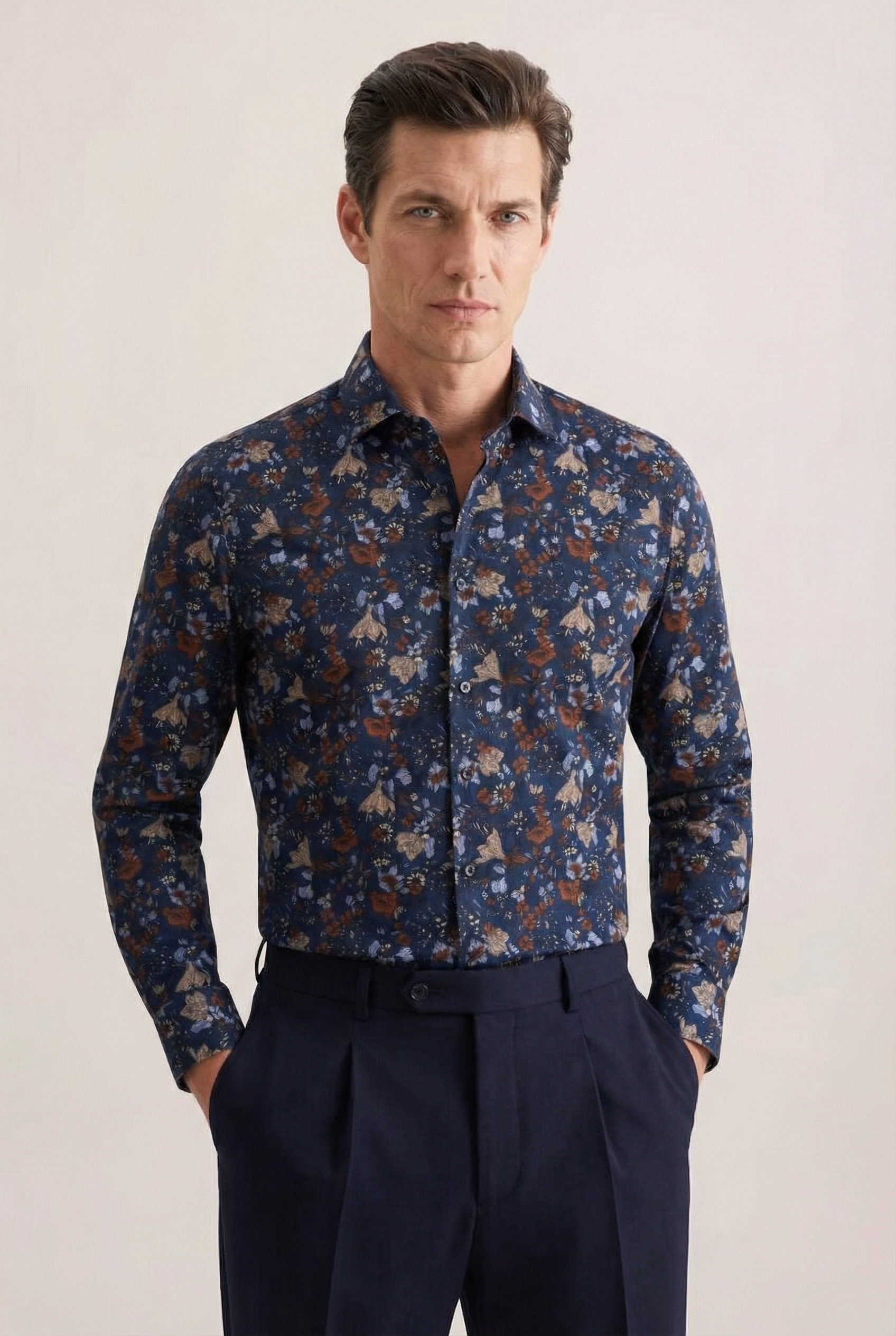 • Приталенный силуэт, Классический воротник, Классический (на пуговице), Принт, Синий